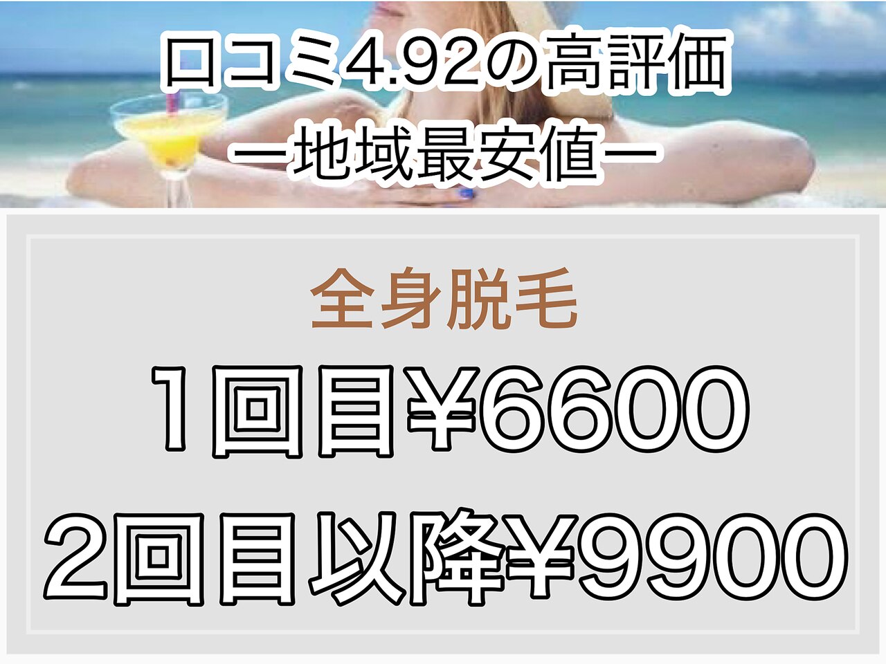 男女年齢問わずたくさんのお客様にご来店頂いております!!ご家族やカップルの方も多数★高リピ率で紹介したいサロン♪都度払いで安心★丁寧なカウンセリング&施術が◎◎◎★初めての方も安心してお任せ下さい!!★VIOも際まで徹底照射が大好評!!駅チカ&敷地内無料駐車場完備★電車も車も便利な隠れ家的プライベートサロン♪