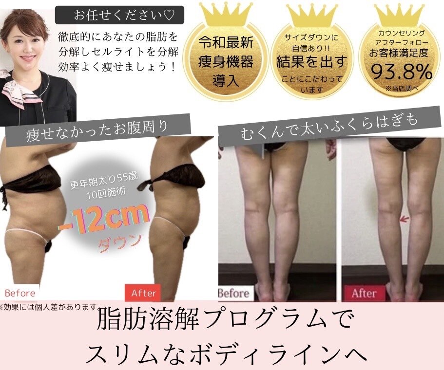 本格ダイエットから究極リラクゼーションまで、お客様のご要望に合わせた施術とサポートを行うトータルビューティーサロンです。痩身、むくみ、理想的な体型を叶えたい方!!効果的な【結果出しマシンかけ放題】が新登場!あなたの『こうなりたい』理想に近づく、カウンセリングと施術で満足の結果をお届け♪