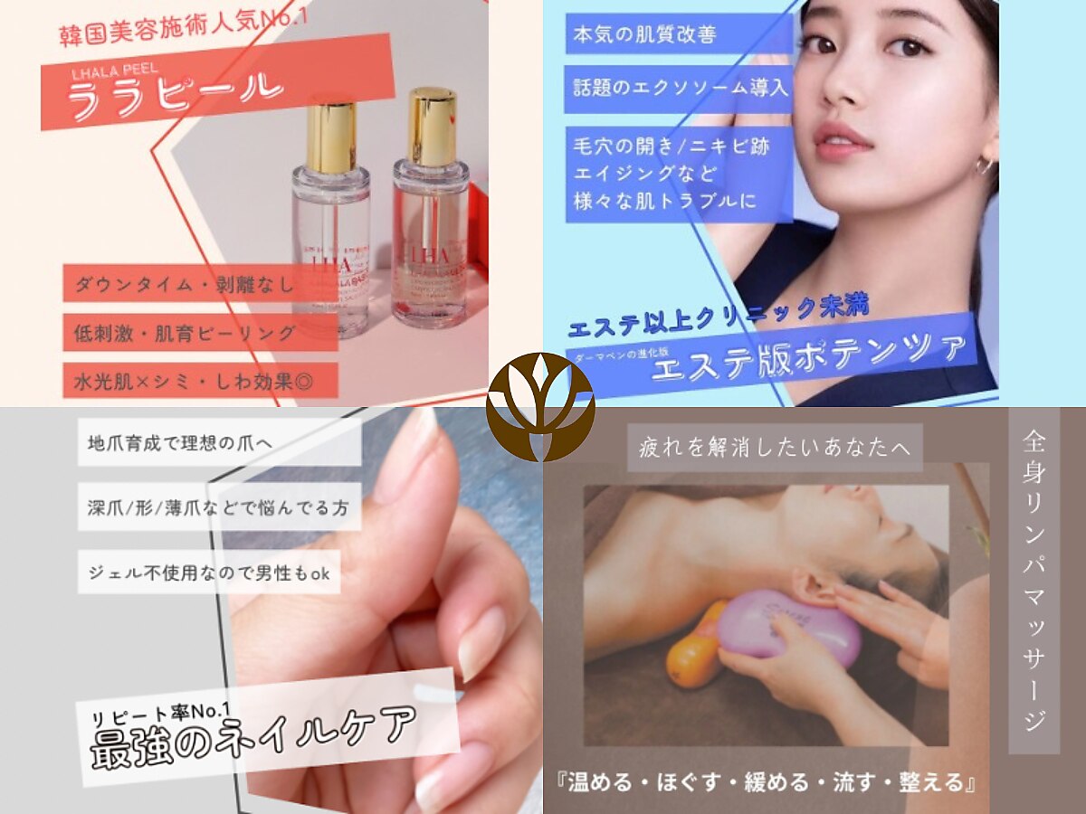当店は美容室内にあるトータルサロンです。今人気のハーブピーリング・フォト・ハイドラフェイシャル(毛穴洗浄)等で、肌メンテナンスおすすめです!明日からの肌が違います♪他には顔の黄金比を考えきれいな目元にするアイラッシュ、ハイクオリティのネイルも高評価の口コミを多数いただいています。是非お任せください