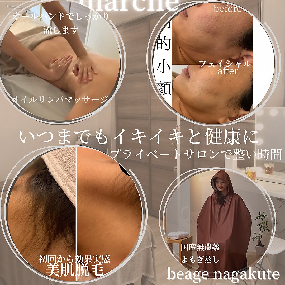 【ご新規様専用体験メニュー有り】【完全個室】【長久手市市役所徒歩5分】リンパマッサージ・フェイシャル・よもぎ蒸し・脱毛のトータルエステサロン。自分では気づかないリンパのつまり・お疲れに直接アプローチ★お一人様ずつのプライベートサロンです。他のお客様とすれ違うことなく、ゆったりお過ごし頂けます。