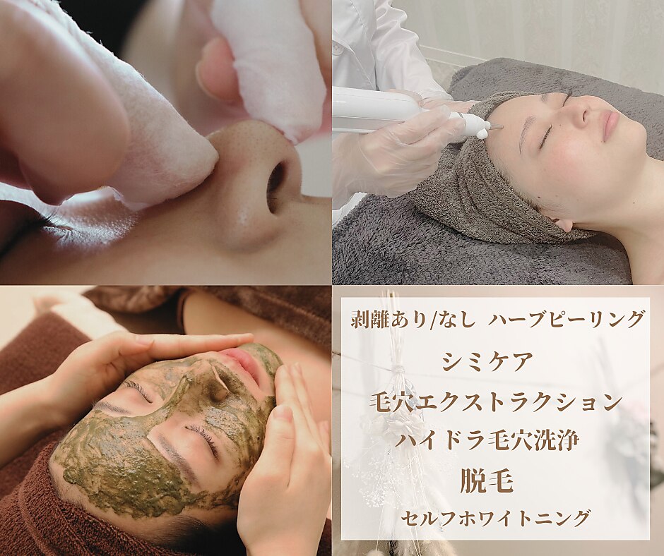メニュー盛り盛りにしました!通いやすくてリーズナブル☆剥けるハーブで根本肌質改善!ハイパワー脱毛機使用で男女関係なく抜ける☆毛穴の最終兵器は毛穴エクストラクション♪シミケアには大小関わらずに全顔狙い撃ち!プラズマシャワー今あるニキビにアプローチ♪全てのメニューに自信あり☆お肌のお悩みお任せください♪