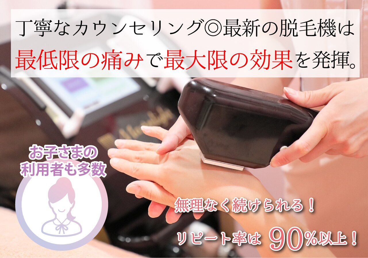 【30代以上に人気サロン】他店で満足されなかったお客様にも選ばれてます◎流れ作業ではなく、お客様としっかり向き合い脱毛計画いたします。デリケートゾーンもゆったりと施術を受けられるよう工夫しており、大人女性の支持率高!お子様にも使える高品質脱毛機を使用。守山区の大人女性限定ワンランク上の脱毛サロンです☆