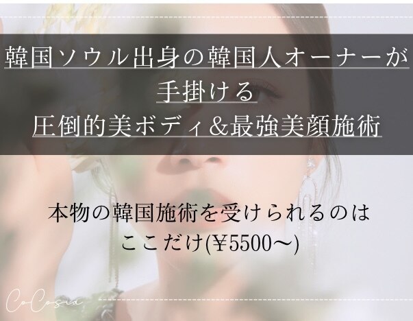 エステが初めての方にも安心して通っていただけるサロン、お客様の笑顔を目指して『CoCosia』は誕生しました♪ココシアは【明確な料金】『No勧誘』【ハイパフォーマンス】を掲げて営業をしております!韓国直伝の手技+日本式のおもてなし+最新のマシンのコラボレーションでお客様を満足へ導きます♪皆様のご来店を心よりお待ちしております☆