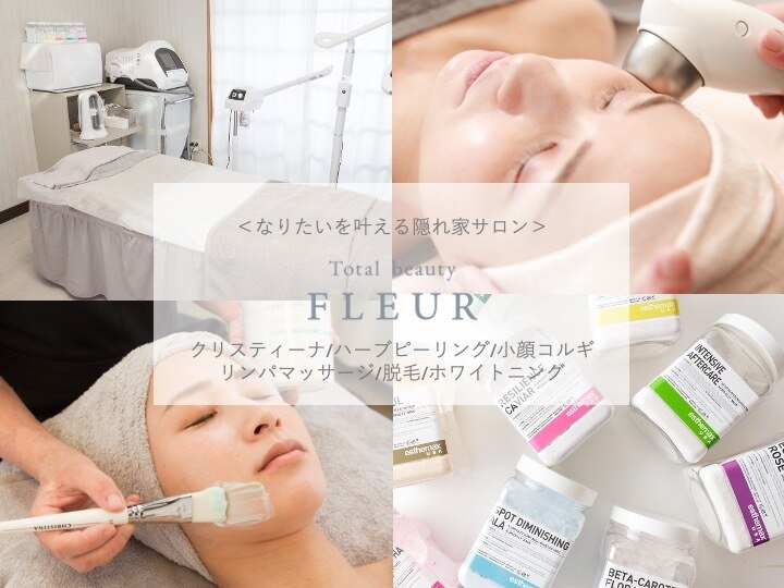 豊川市御油町にある完全個室サロンです♪FLEUR(フルール)はフランス語で花を意味しております。お客様の笑顔に、人生に"華(花)"を添えられるようなお手伝いをさせて頂きたいと思っております♪栄養士資格所有のオーナーが中からもサポートいたします☆フェイシャル各種、リンパマッサージ、痩身、脱毛、セルフホワイトニングとあらゆる方面からお客様のキレイのお手伝いをさせてください!