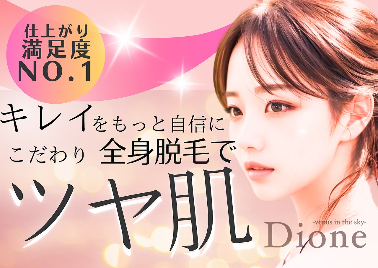 ホッとして頂ける空間とお客さまのお悩みや興味にしっかりとお応えさせていただきます。予約が取りやすく、丁寧なカウンセリングなど心地良い接客サービスを心掛けています。美肌になれるハイパースキン脱毛は低温脱毛で3歳でもおOK!諦めていた敏感な方も脱毛体験で感動されます!産毛,色黒,乳輪内など通常NG部分の脱毛もOK!顔脱毛,VIO脱毛,全身脱毛脇脱毛が人気です。是非Dioneへ!