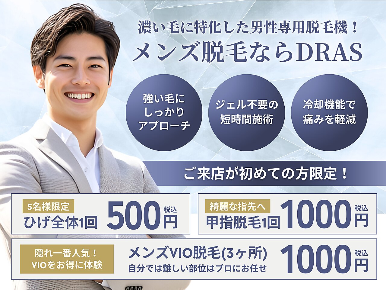 2022年1月11日NEW OPEN!完全個室・予約制なので他のお客様と会うことがなく、男性スタッフなので悩みを相談しやすい♪リーズナブルな価格、冷却機能付きの痛みの少ない脱毛機採用で脱毛デビューにもオススメ!脱毛以外にも気になる毛穴の汚れケアコースもごさいます◎お気軽にお問い合わせ下さい!