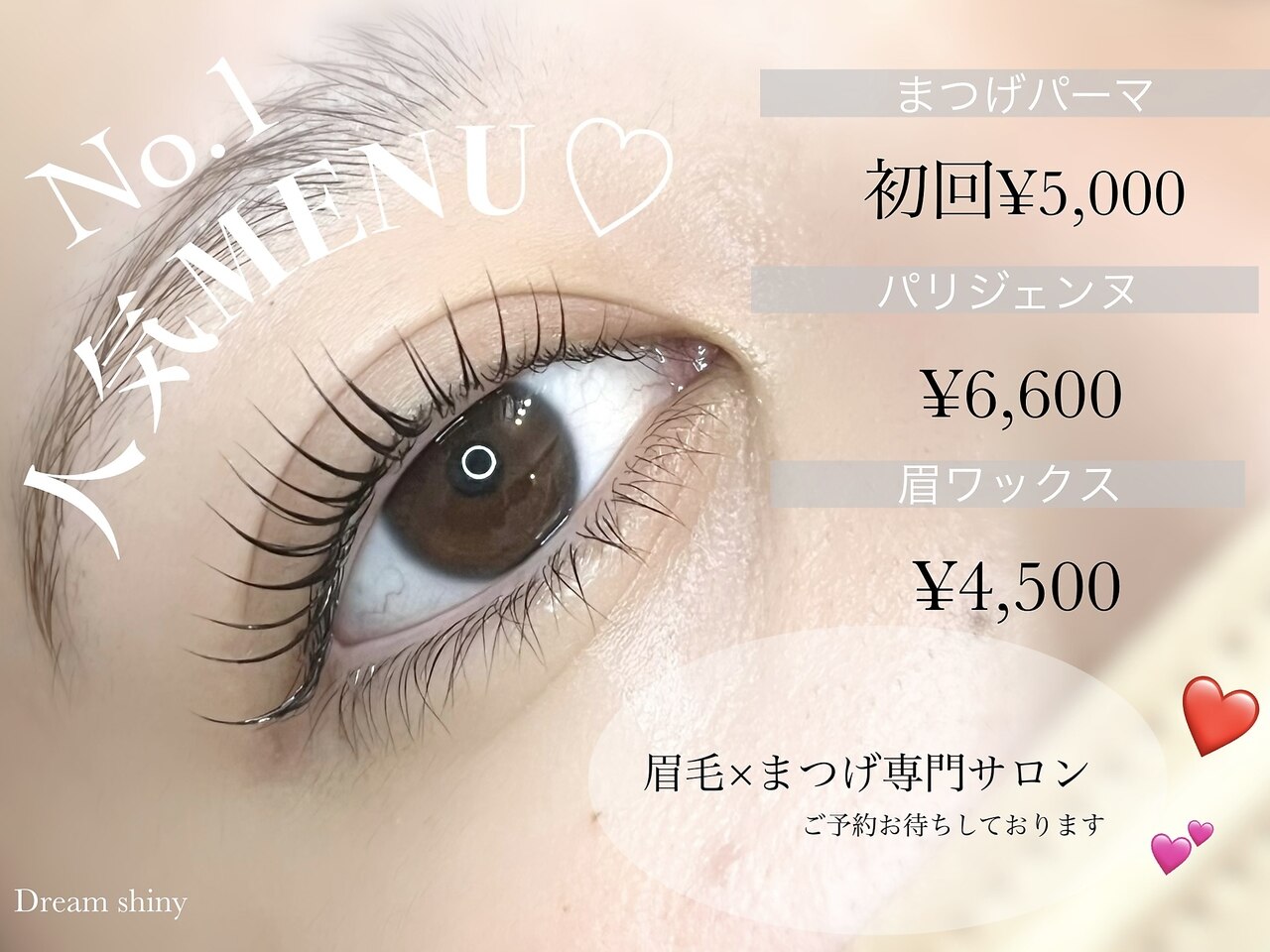 dreamshinyスタッフおすすめ【眉ワックス×まつ毛カール】セットメニュー¥9500 ★圧倒的なセンスでなりたいを叶える◎丁寧なカウンセリングで初めての方も安心♪オシャレで落ち着いた店内でゆっくりリラックスいただけます☆ マツエク/まつ毛パーマ/パリジェンヌラッシュリフト/フラットラッシュ/バインドロック/アイブロウ