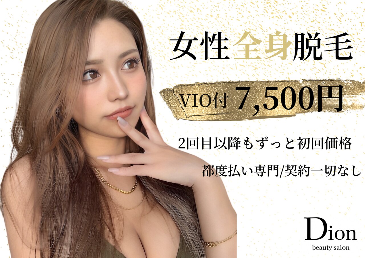 この度は、脱毛サロンDion【ディオン】久留米店のページをご覧頂きありがとうございます。ディオンでは結果重視、お客様に無理なく通えるサロン作りを出来るように心掛けております。《都度払いのみ》《無理な勧誘なし》《コース契約なし》で脱毛初心者でもお気軽にご来店頂けます!男性の方もかなりの数ご来店頂いております♪是非この機会に脱毛サロンDion【ディオン】にお越し下さい!