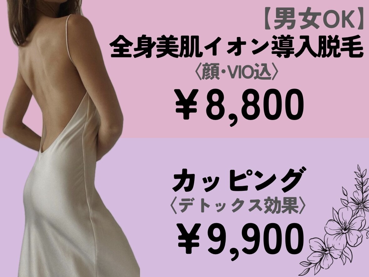 初めてで不安な方や他サロンでも満足できなかったにおすすめ♪国家資格保持者運営で、圧倒的信頼感と脱毛効果◎痛みが少ない最新脱毛技術!敏感肌でも透明感あるツルスベ肌へ♪毛穴洗浄&アイブロウ&ハーブピーリング&リンパマッサージなど豊富なメニューご用意♪お客様のお悩みに合わせてご提案いたします!仕事終わりOK◎