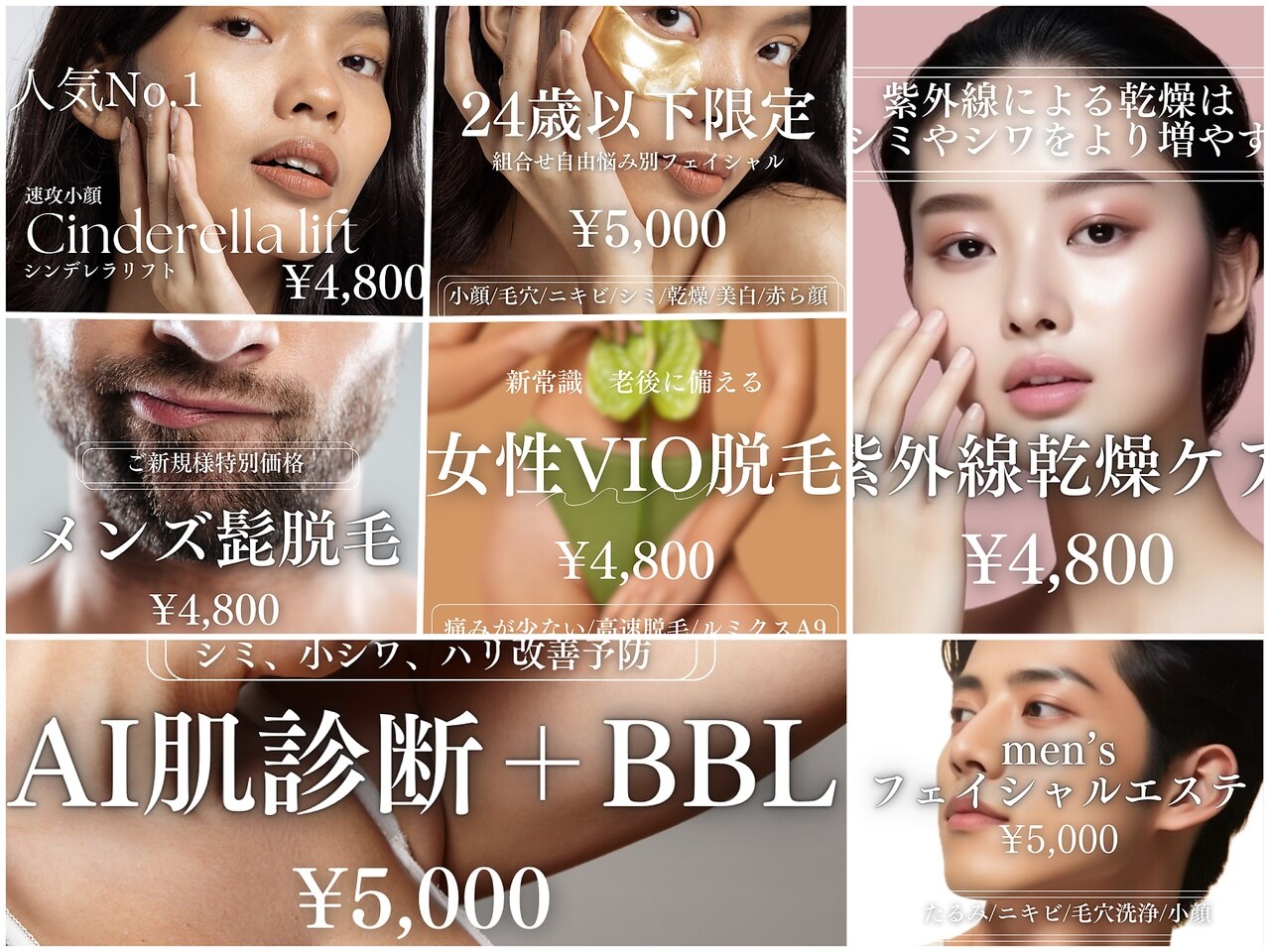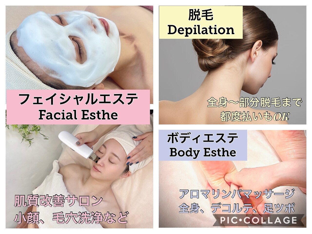 お肌の気になるお悩みや、現状に満足できていない方へ。個室空間でこころゆくまでしっかりメンテナンス♪《美肌/小顔/毛穴ケア/脱毛/シミケア…》お客様一人一人が通いやすく立ち寄りやすい、笑顔でまた来たい思える、ご満足いただける丁寧な施術を心がけております!