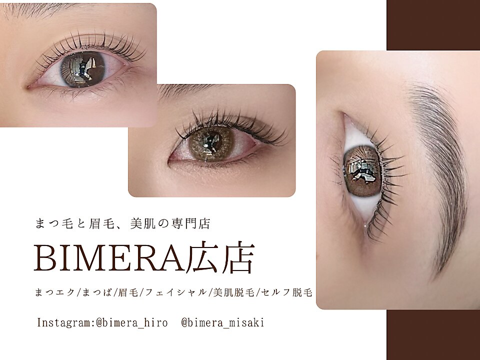 BIMERA(ビメラ)広店では【まつげ】・【眉毛】・【脱毛】・【エステ】ともにお客様一人一人に合わせて施術を行い、結果に自信を持っています。初めてで不安な方、通えるサロンをお探しの方、是非お越しください!心を込めて満足のいく接客・施術を致します♪【全身脱毛】や【VIO脱毛】などに関する不安点も是非お問い合わせ下さい。広島県/呉市/広