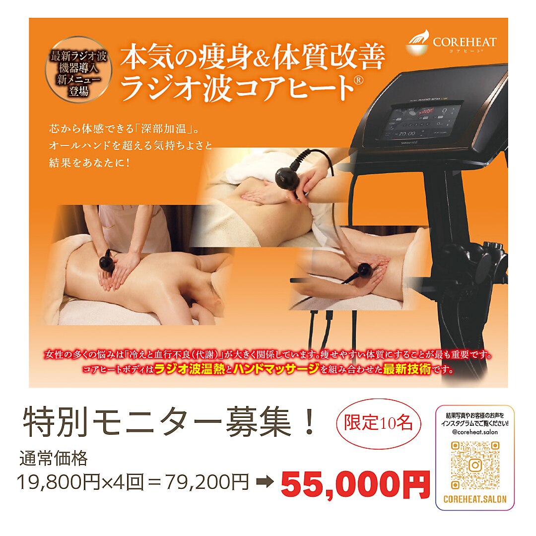 年齢とともに代謝が落ちてきて自力では痩せられない40代・50代・60代におすすめの【眠ってしまうほどの心地よい痩身エステ】更年期の不調も緩和します。【対極板付きのコアヒート】で身体を芯から温め、代謝アップで痩せやすい身体を作ります。コアヒートなら痩せられる!70キロ以上の方、エステ初心者の方も大歓迎です☆