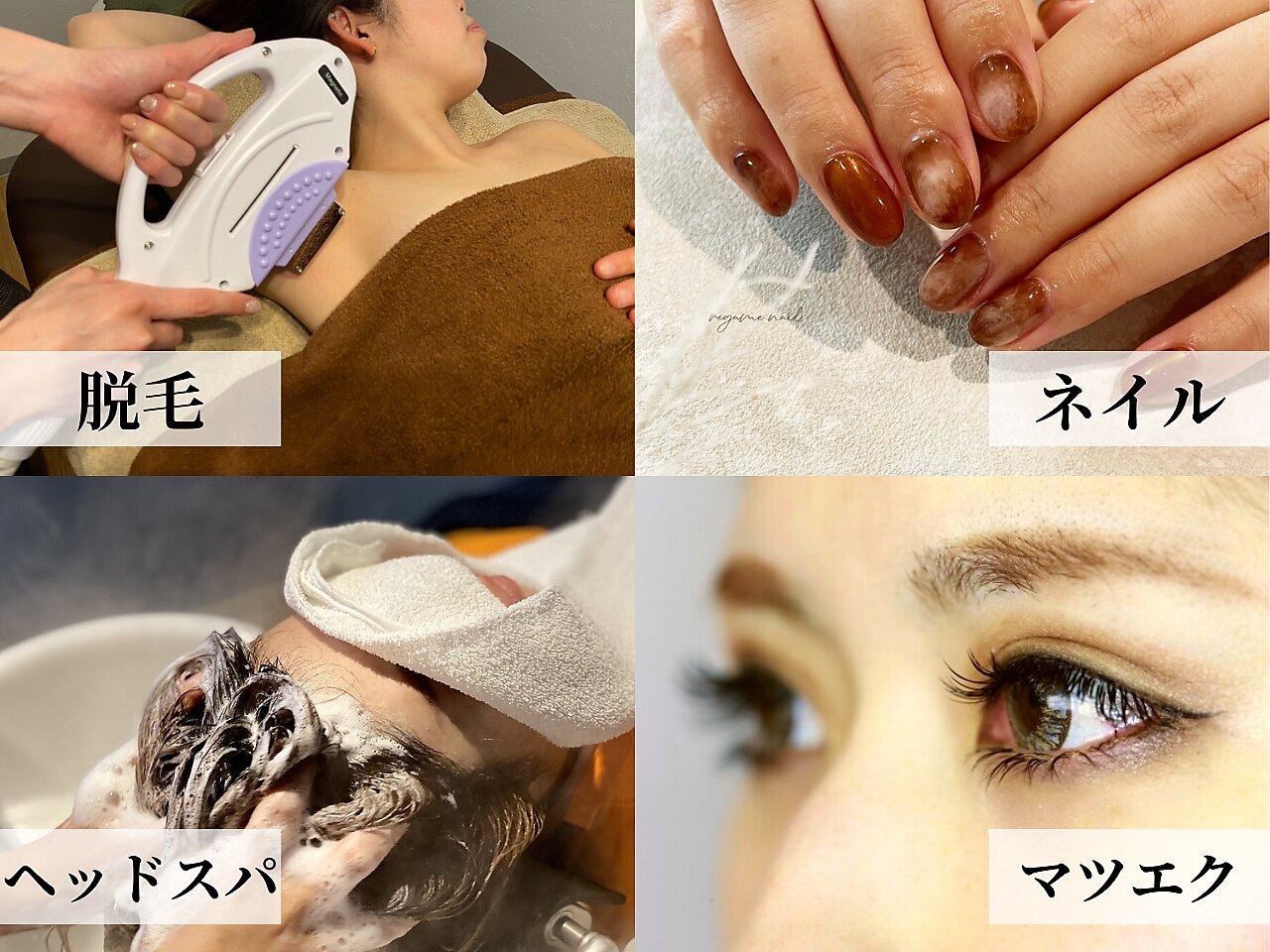 【ネイル】【ハーブピーリング】【痩身】【脱毛】【ヘッドスパ】【光フェイシャル】【ダイエットサポート】で皆様のキレイのお手伝いをさせていただきます★ネイルは豊富なデザインをご用意♪フィルインで爪に優しい◎剥けない芸能人御用達ハーブピーリングでツヤのある陶器肌へ!1度の施術で劇的変化!フォースカッターで理想の体へ◎脂肪燃焼!引き締め!妊娠線にも効果◎REVI取扱店