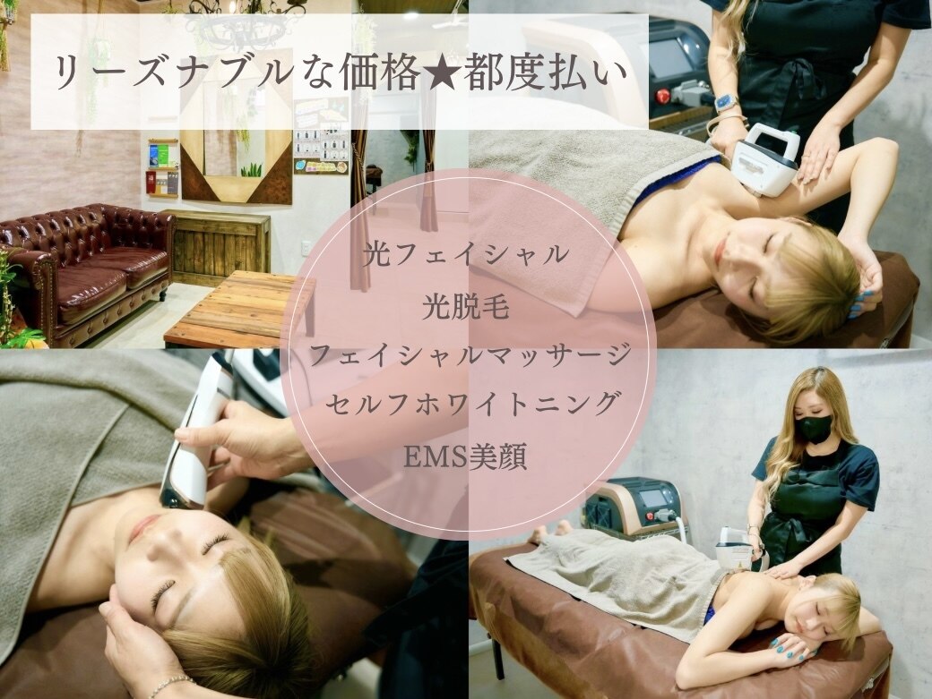 老若男女問わずご来店いただけるアットホームなプライベートサロン★痛みを最小限まで抑えた光脱毛は脱毛初心者にピッタリ!パーツ脱毛も◎最新美容液導入EMS美顔器でたるみやくすみケアに♪肌質改善しながら同時にリフトアップ☆セルフホワイトニングで真っ白でピカピカの歯に☆都度払いで2回目以降もお得◆学生30%オフ◎