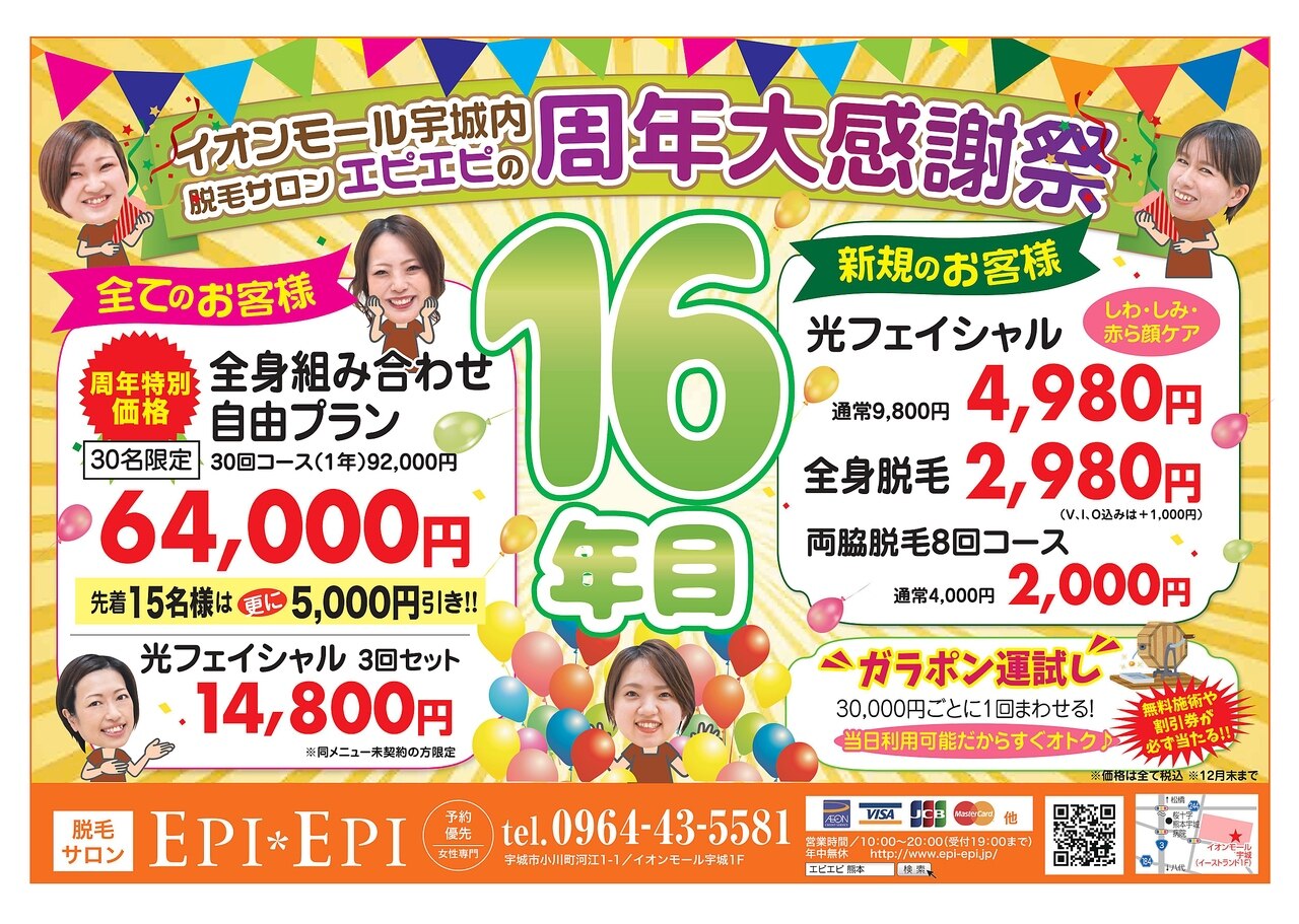 15年目。累計6万件超の施術実績。熊本【イオンモール宇城】★女性専門★エピエピは【最新連射機 4台】で予約も取りやすく【料金が明確】【施術部位の区切りが広い】【全身脱毛も部分脱毛もOK】だから効率よく、お得にスベスベお肌へ【お試しプラン】で【効果】と【お店やスタッフの雰囲気】確認してみて下さい