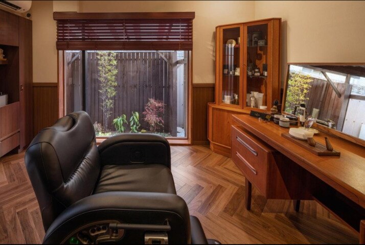 京町屋を舞台とした理容学校の「離れ」に、密かに存在する床屋です。床屋と言っても、皆さんが想像する床屋ではありません。古き良き時代を感じながらも、ホテルのヴィラようなラグジュアリーな空間で性別や年齢も問わず、誰もが行ってみたいと感じ、魅力的に映る店を目指しました。選ばれし理容師が完全予約制で完全個室、完全マンツーマンにて、あなたの肌と心をより美しく整えます。