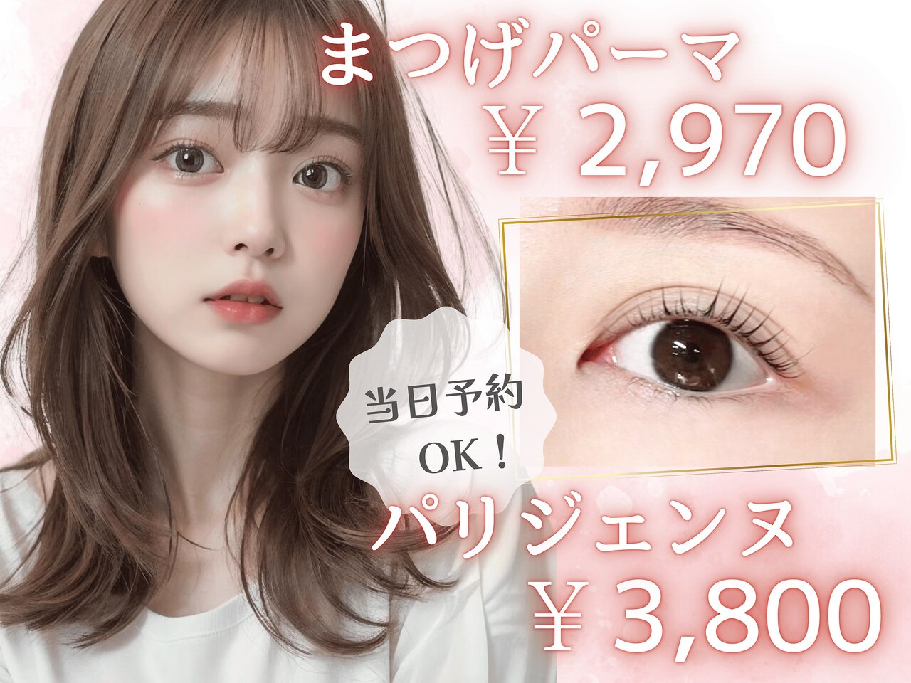 土日・祝は朝9時open♪当日予約大歓迎☆話題の韓国風束感パーマ¥2800~/パリジェンヌ¥4400~予約が×の場合も電話で一度ご相談ください!フラットラッシュ/ハリウッドブロウ/上下まつげパーマ取り扱い店○パーマデザインはナチュラルから根本立ち上げのゴージャスまで幅広いデザインからお選びいただけます