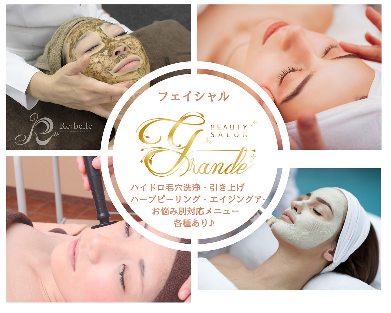 肌質改善はGrandeにおまかせ◎話題の【ハイドロ毛穴洗浄】【ハーブピーリング】【リベルハーブピーリング】【ヒト幹細胞導入】【シミケア】それぞれの肌悩み・エイジングケアに特化したメニュー多数取り揃えてお待ちしております♪低価格美肌脱毛・痩身も全てが叶う☆あなたに寄り添いしっかりカウンセリング◎当日予約OK!