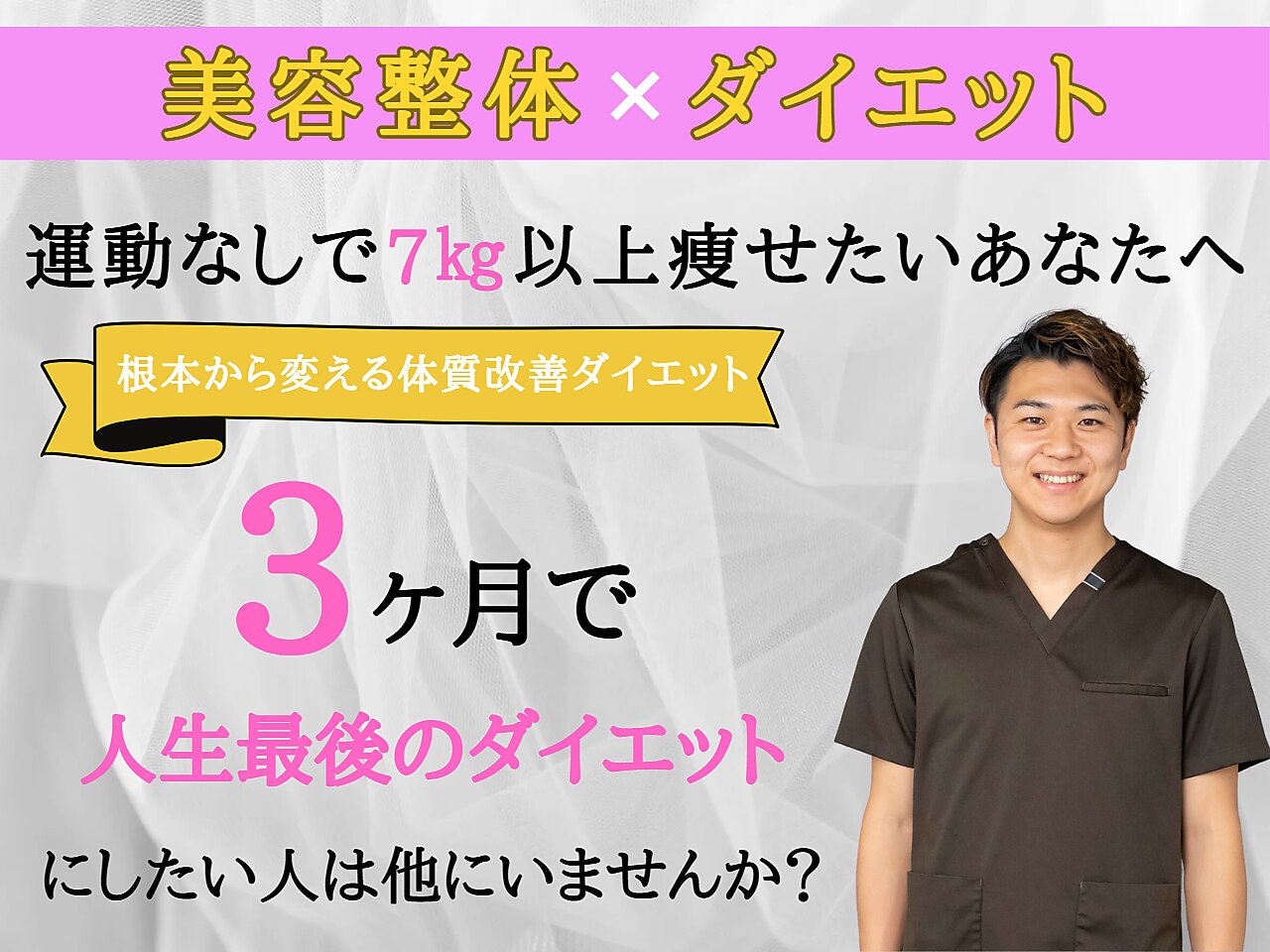 今年の脂肪は今年のうちに!! 3ヶ月で7kg痩せたい! 着たい服が着れない。お腹周りが大きくなってきてなかなか痩せない。 悩んでいても1kgも痩せていきません。行動を変えた方だけが痩せていきます!痩せる知識と痩せる習慣を手に入れませんか?お一人お一人に合わせてご提案し、理想の体へと導きます!