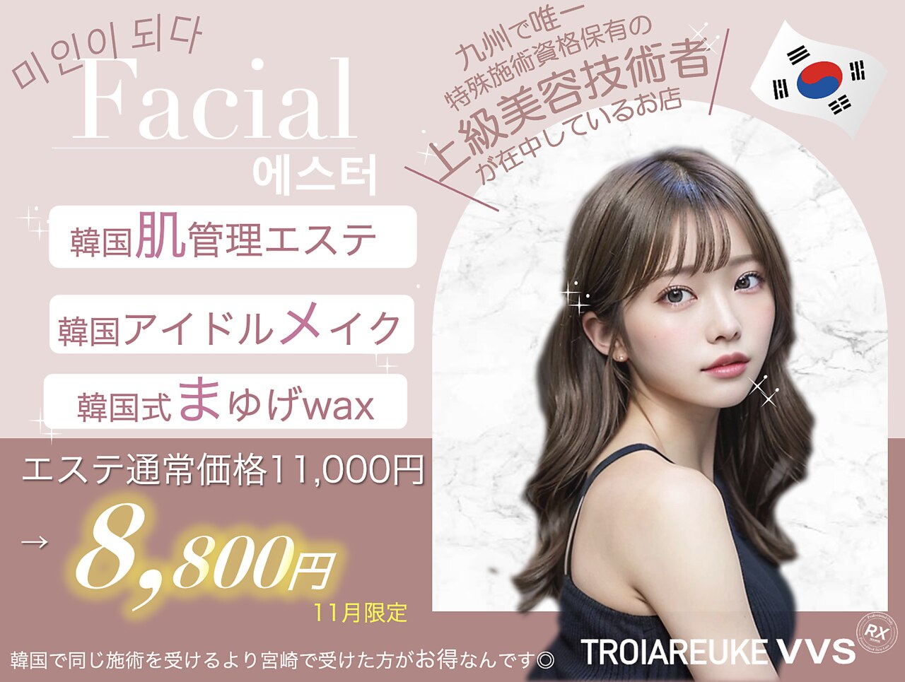お肌の根本改善を目指します。お客様の一人一人にあった施術ができるオーダーメイド制です。お悩みや不調に合った施術内容をご提案させて頂きます。韓国でアイドルメイクをマスターしてきました。宮崎にも最先端の情報を常に持って帰ってくる予定です。マタニティの方や産後の方、肌が弱い、敏感肌の方でもエステ可能です。