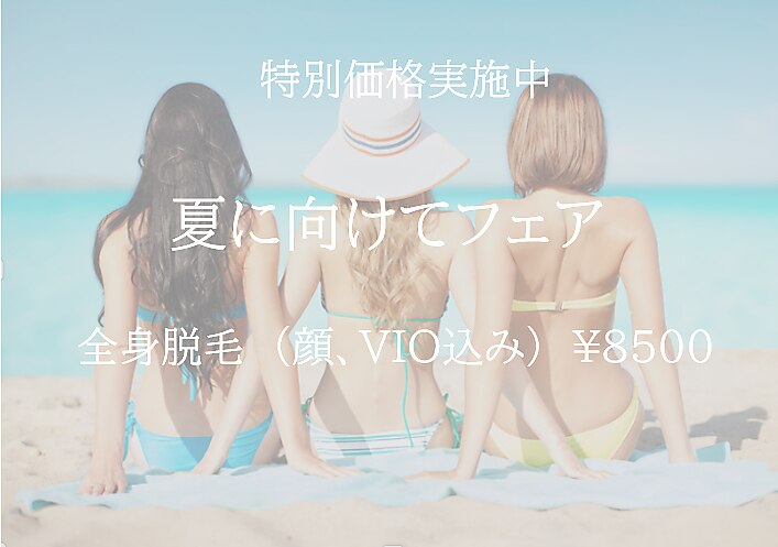 ‘‘完全都度払い‘‘で初めての方でも気軽に通える♪いつでもお手軽に脱毛が可能◎【IPL×SHR=ハイブリット脱毛】を導入!!肌質や毛質問わず、しっかりと濃い毛までアプローチ!!コラーゲンジェルを使用しお肌も乾燥知らずのつるスベ美肌脱毛!!《メンズ脱毛あります》