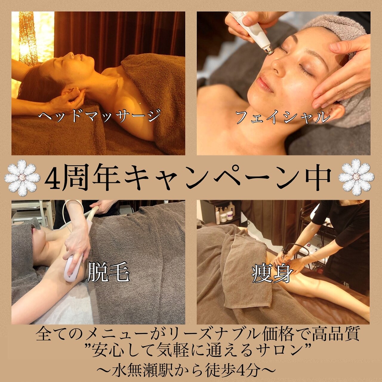 水無瀬駅から徒歩4分の便利なリッチにある,トータルエステサロンです。フェイシャルエイジングケア,痩身,脱毛,リラクゼーション,と,幅広いメニューでお待ちしております。二階は女性専用,一階がメンズ対応サロンです。メンズ脱毛、メンズエステは男性が施術致しますので、お気軽にご相談ください。《シミ/しわ/たるみ改善》