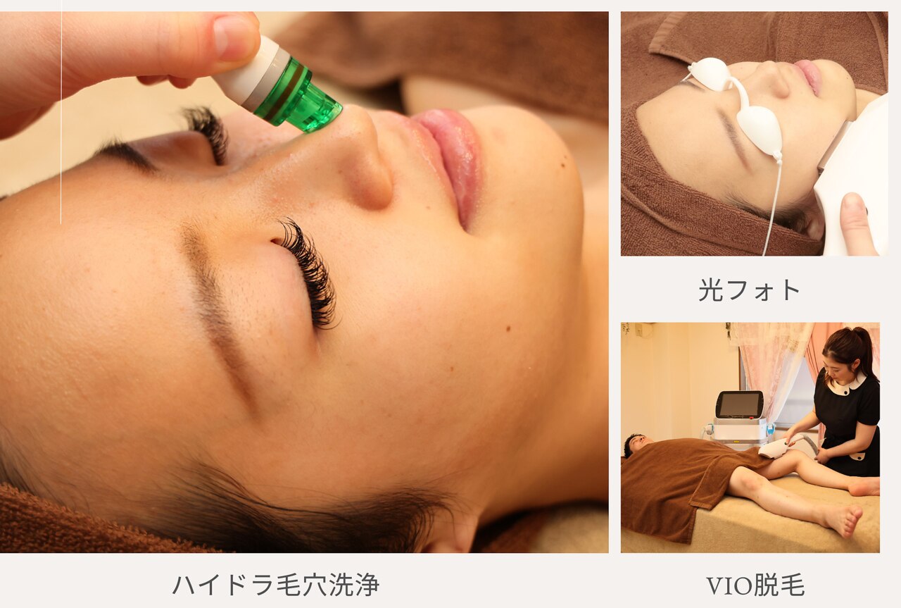 当サロンでは光フォトや、しっかり毛穴洗浄をしながら美容成分を導入するハイドラフェイシャル、お肌の敏感なお子さまにも対応できる程の安全性の高い最新式の「THR脱毛機」を採用しております。お客様のお悩みに寄り添い、全力でサポートさせていただきます。笑顔でお帰りいただけることが何よりもの喜びです。皆様のご来店をスタッフ一同、心よりお待ちしております。