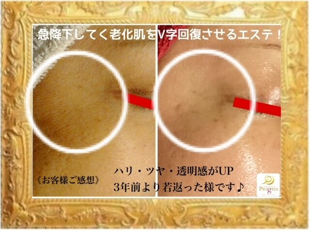 3年前より一気に老けた印象になった方!急降下していく老化肌をV字回復!Progresでは良質な生ヒト幹細胞培養液や凍結乾燥ヒト幹細胞培養液を深部導入!肌活性を促進し透明感あるハリツヤ肌へ♪ 筋肉,リンパに働きかける独自のマッサージ法でリフトアップ、フェイスラインもスッキリし鏡を見てメイクも楽しくなる毎日にっ♪