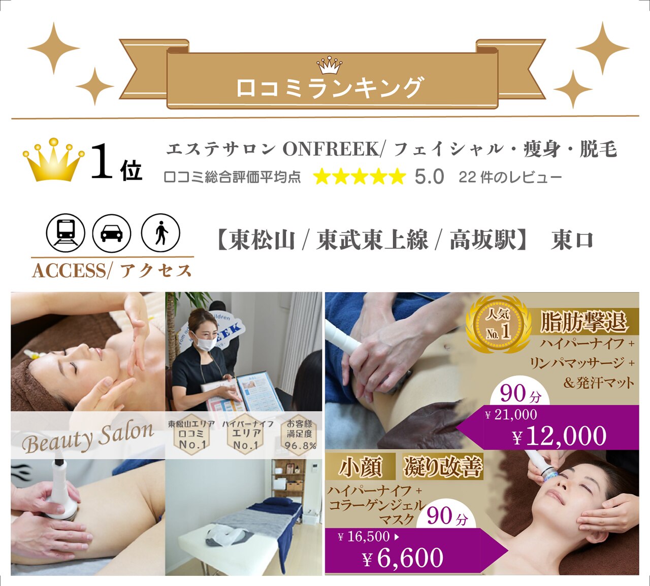 ご覧頂きありがとうございます。オンフリークはお客様のご要望・お悩み解決にお応え、初めての方にもおくつろぎ頂けるよう心掛けております。プライベート空間でリラックスして施術がお受け頂けます。幅広い年齢層の方にご来店頂いており、脱毛・痩身・フェイシャル・骨盤美容整体のトータルサロン・ハイパーナイフ・ルミクス・リアボーテ導入店 お肌やお体のお悩み解決へ導きます。