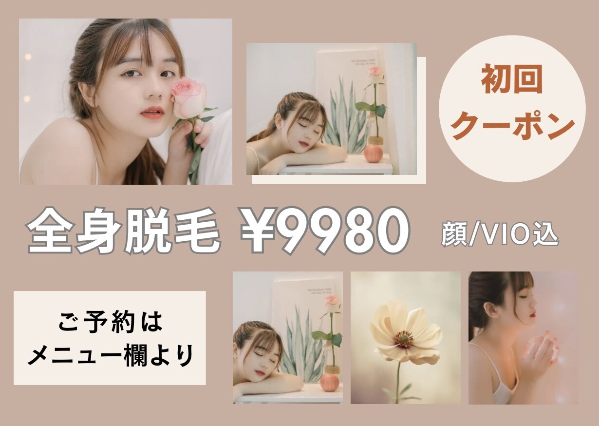 回数券は一切なし!!スタッフも増員し、基本2人体制で行うのでスピーディーに仕上がり◎営業時間21時迄★保湿効果に優れた肌に優しいジェルを塗布して脱毛を行うので、肌荒れでお悩みの方にも◎出力の高い最新脱毛機で男女共に大人気♪当日相談して部位を決められる「ご相談クーポン」も◎指名予約も可能★※指名料別途¥1000