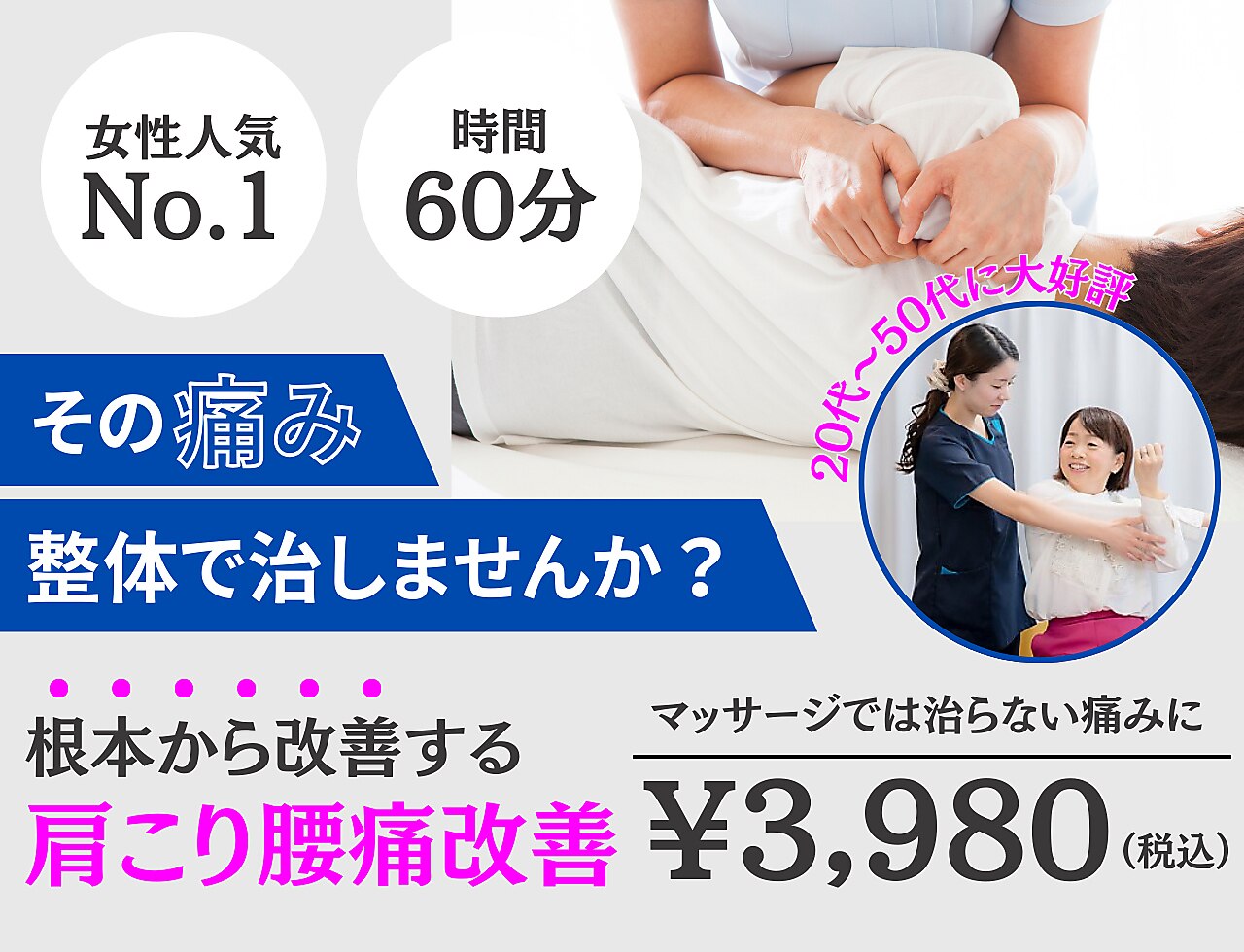 | 営業時間 | 【月~金】9:00~20:00/【土曜・祝日】9:00~18:00[整体/骨盤矯正/マッサージ/小顔/肩甲骨/肩こり/腰痛/頭痛/ストレッチ/マタニティ/産後骨盤矯正/ドライヘッドスパ/ヘッドマッサージ] |