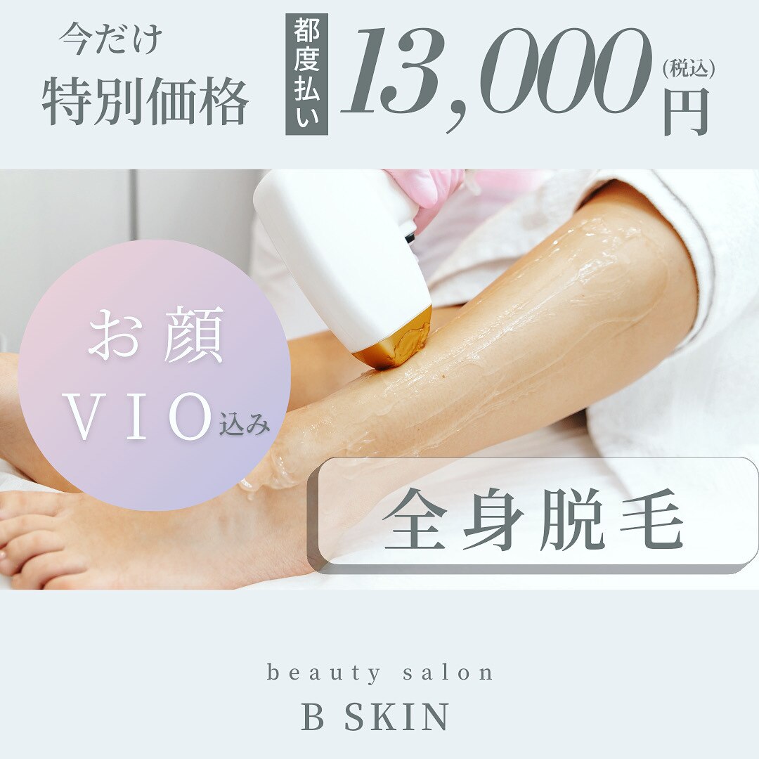 【賢い人が選ぶサロン◎】確かな結果と隅々まで丁寧な照射!B SKINの脱毛機は美肌効果もある最新機器◎都度払いで無理な勧誘は一切なし!!ザラつき・黒ずみを解消する毛穴洗浄も大人気♪VIO脱毛はセルフで当てにくい部分はしっかりスタッフがサポート※メンズVIOはご説明のみとなります。ご家族・ご友人同士ペアセルフも可◎