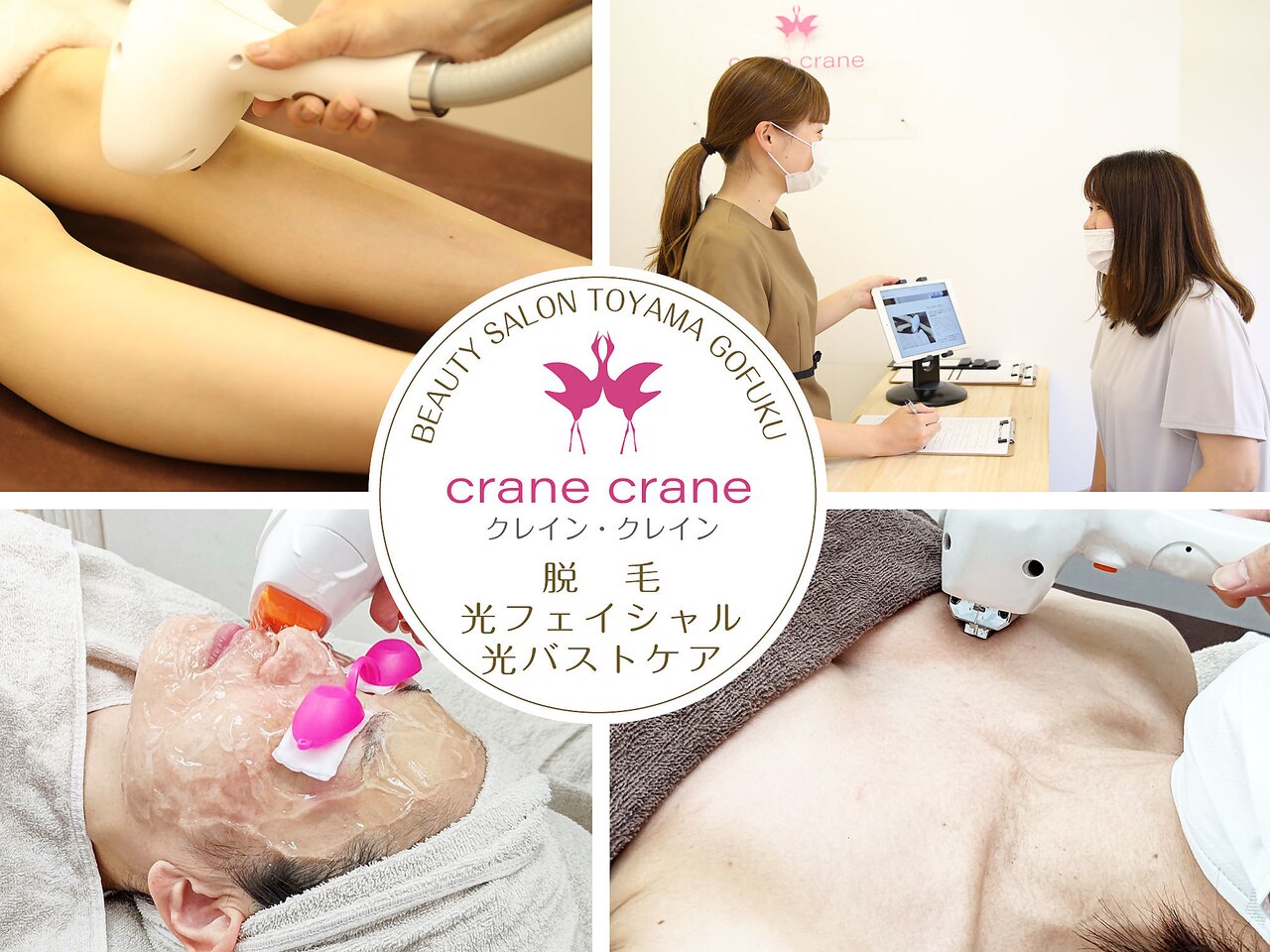 crane craneは、気軽に脱毛や光フェイシャルを経験して頂きたいと思い、富山・五福でオープンしました。完全都度払いで無駄なく通えます。最新の機器を導入し、施術も最短5分なので学校帰りや買い物ついで、仕事帰りに気軽にお寄りください。カウンセリングは必要な事のみ、コースや高額な商品など取り扱いがないので短時間で終わります。
